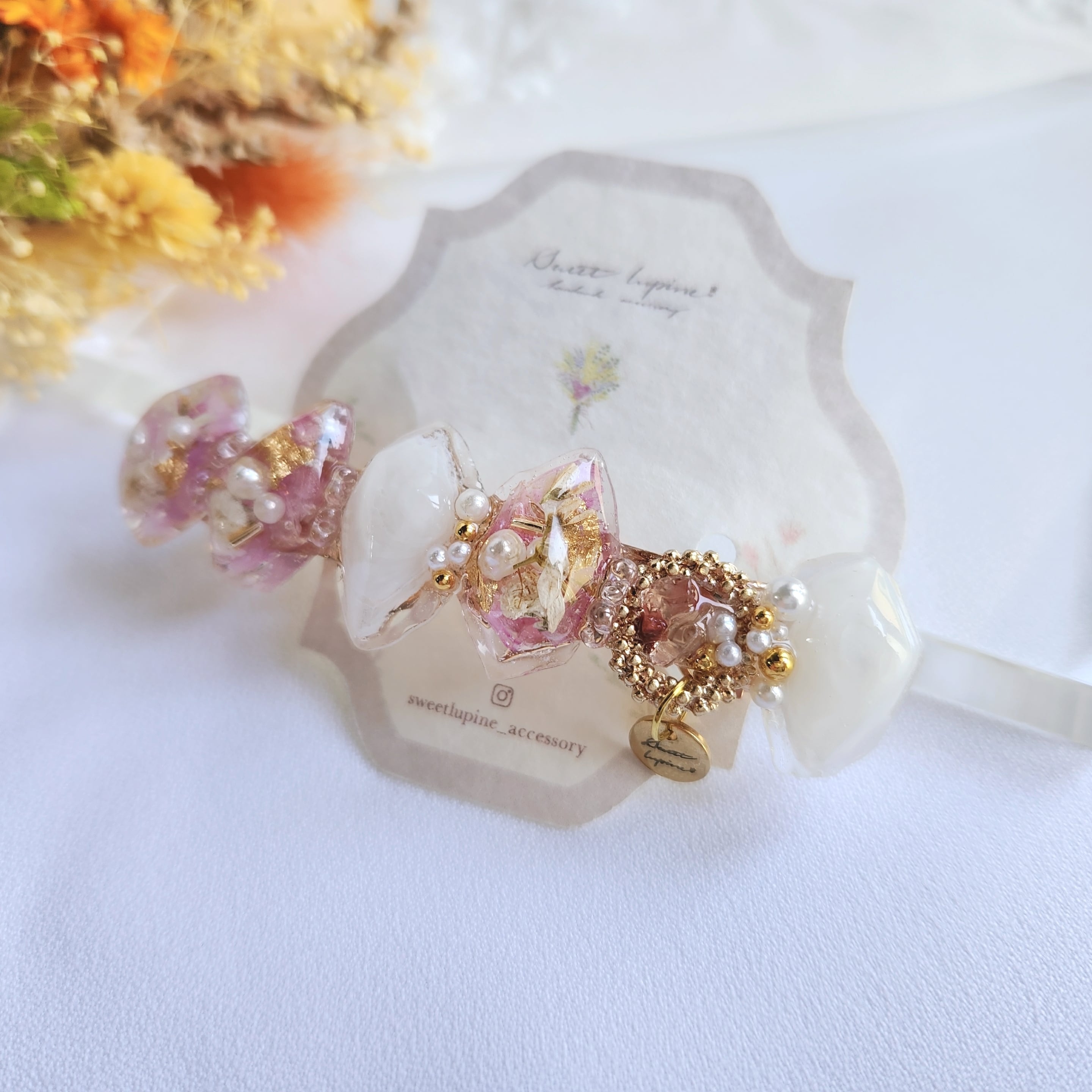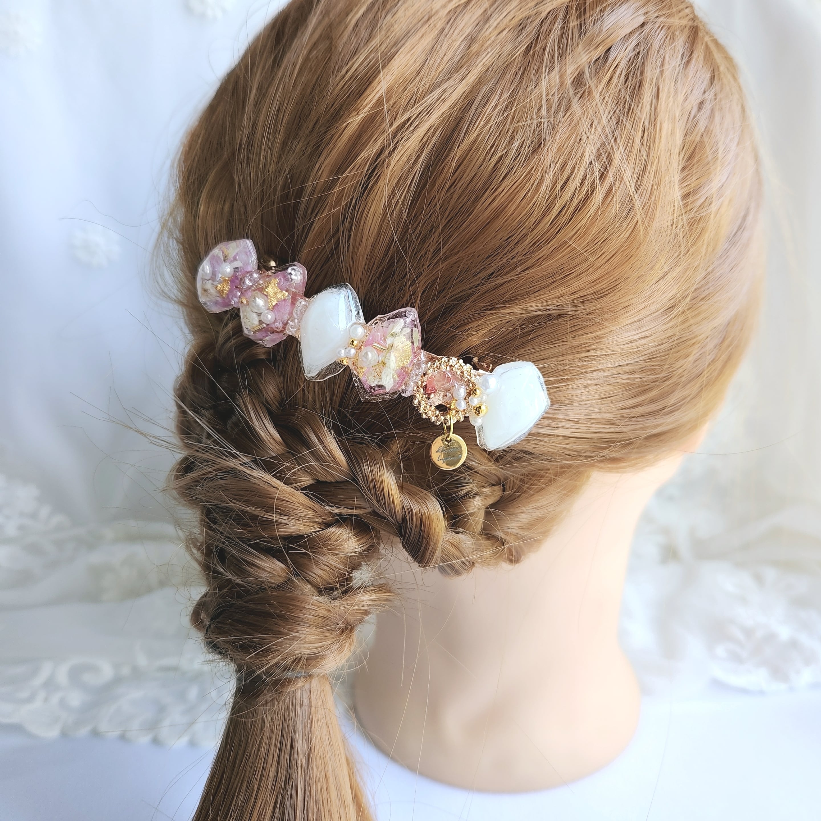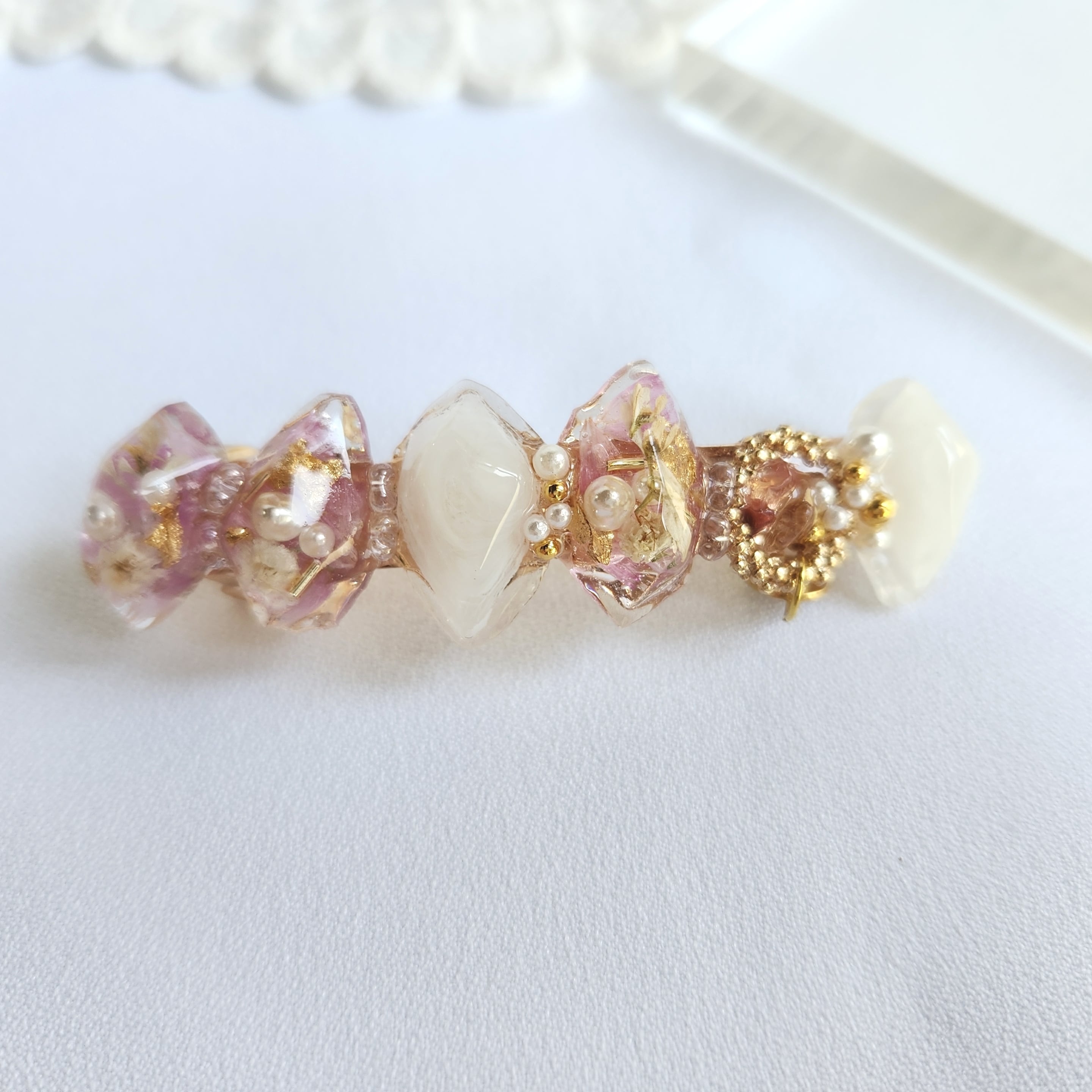 【淡いピンク】 大人綺麗め フラワー お花いっぱい レジン 鉱石 ロングバレッタ ♡ ヘアアクセサリー 結婚式 プレゼント 上品 髪飾り 髪留め
