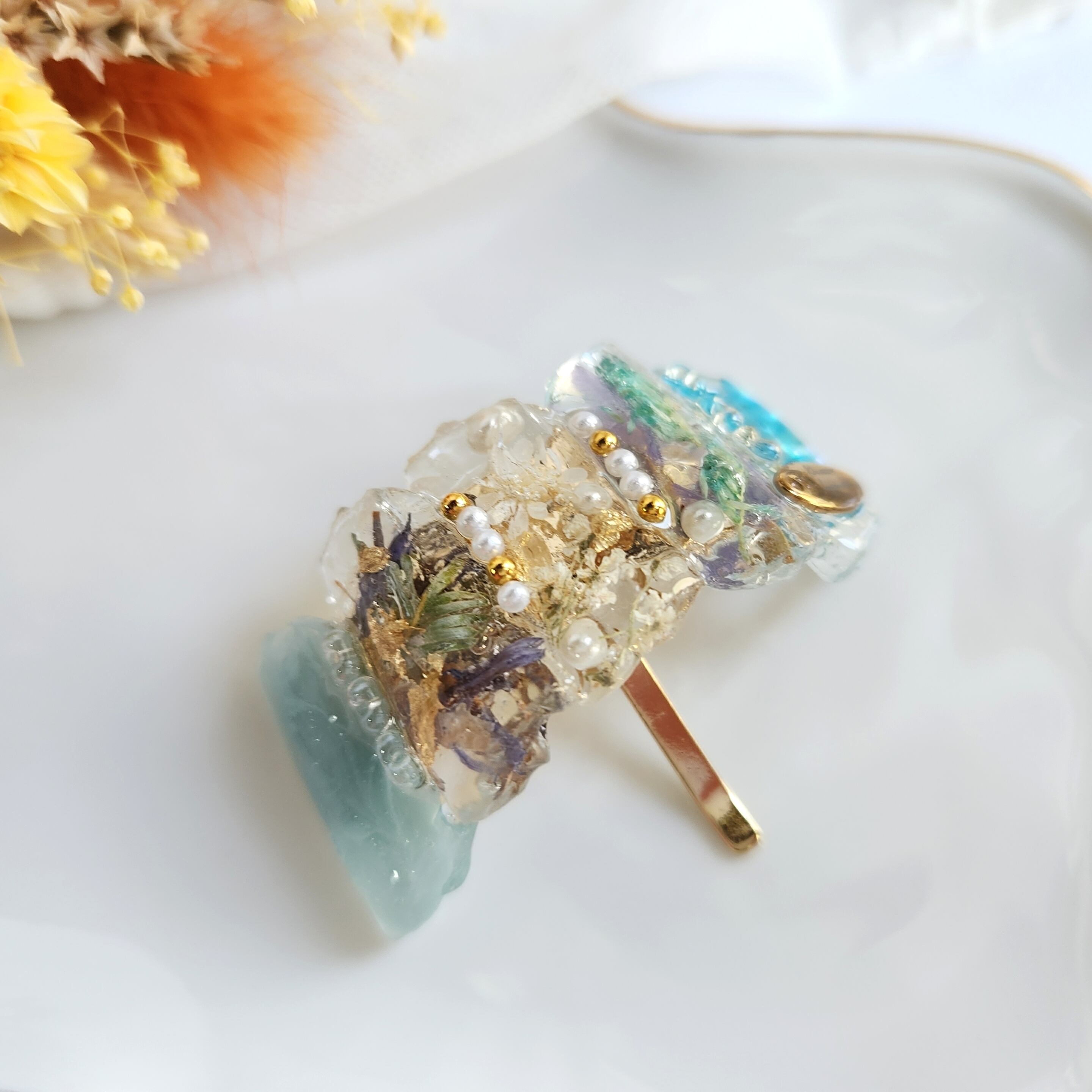 【ブルー】大人綺麗め 鉱石 フラワー レジン♡上品 簡単 アレンジ お呼ばれ ヘアアクセサリー