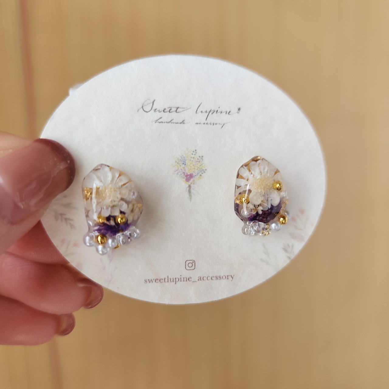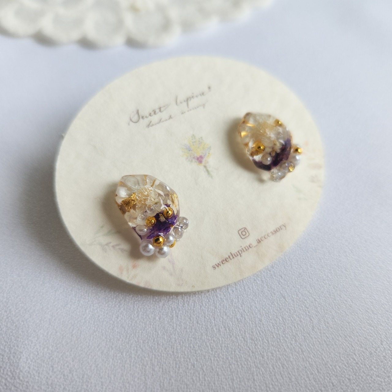 小さな宝石【パープル】小ぶり フラワー カスミ草 レジン イヤリング/ピアス♡フォーマルにも 上品 綺麗め お呼ばれ 結婚式 普段使い パール