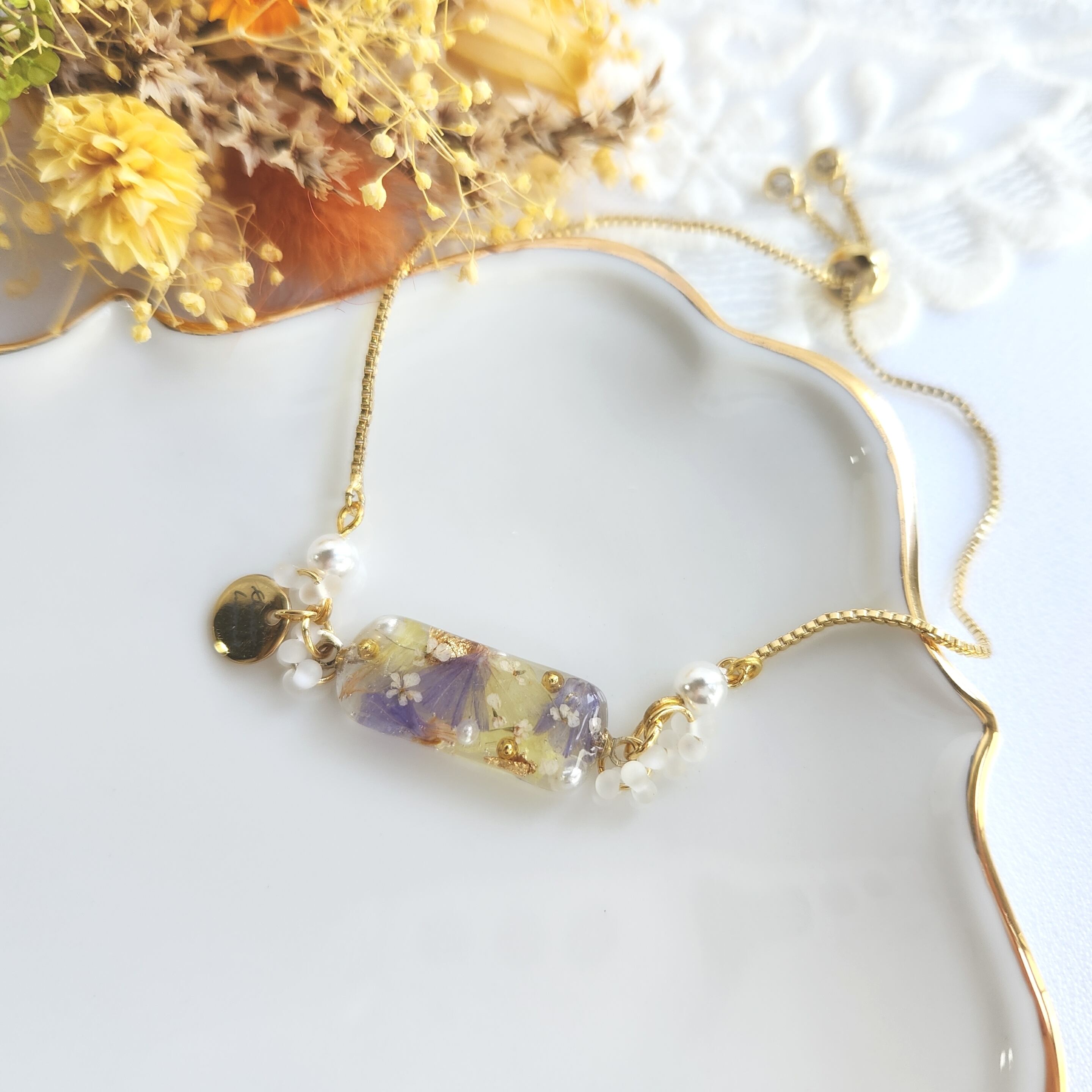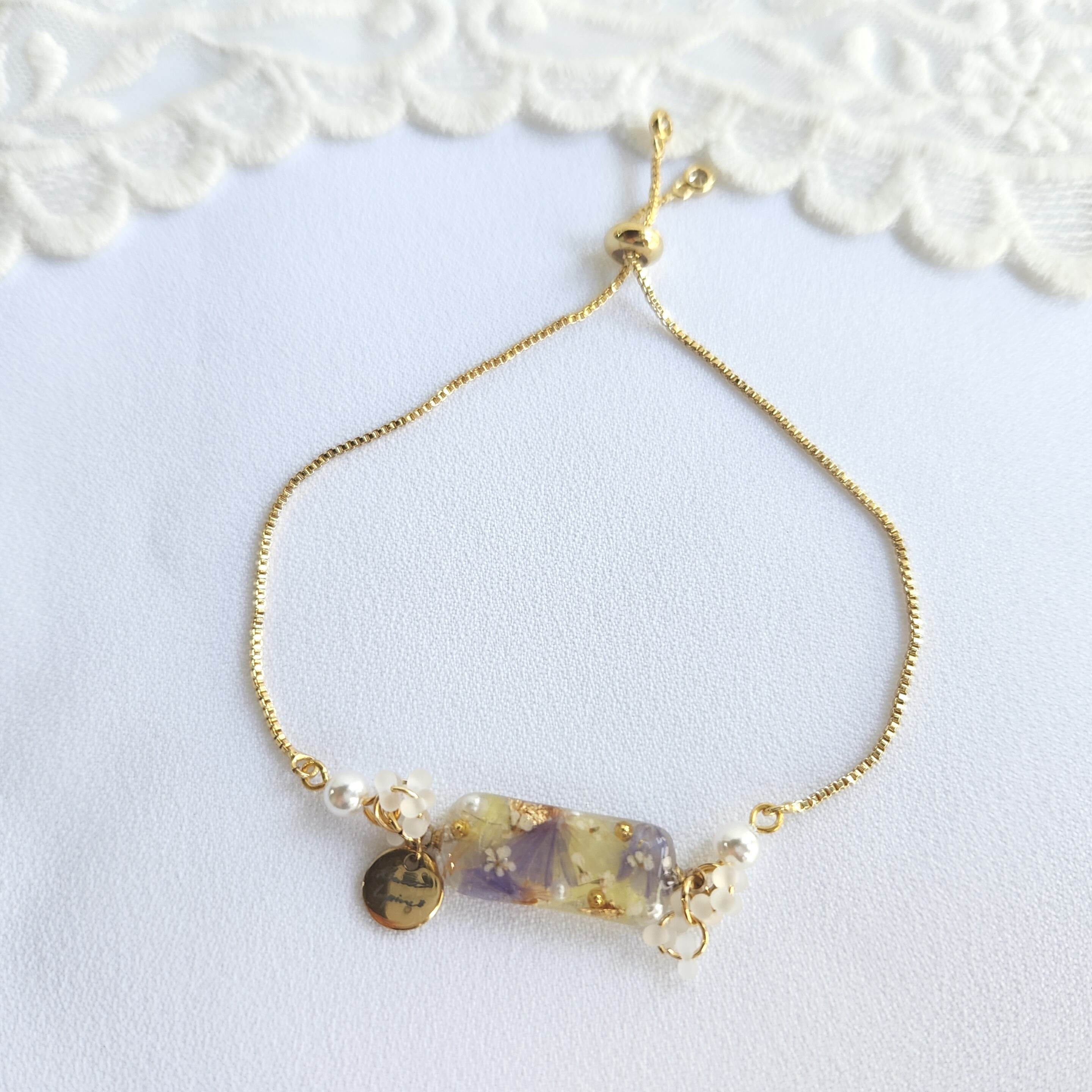 【ブルー&イエロー】大人綺麗め フラワー レジン スライド式ブレスレット♡ドライフラワー 上品 綺麗め 普段使い 着脱簡単 フリーサイズ