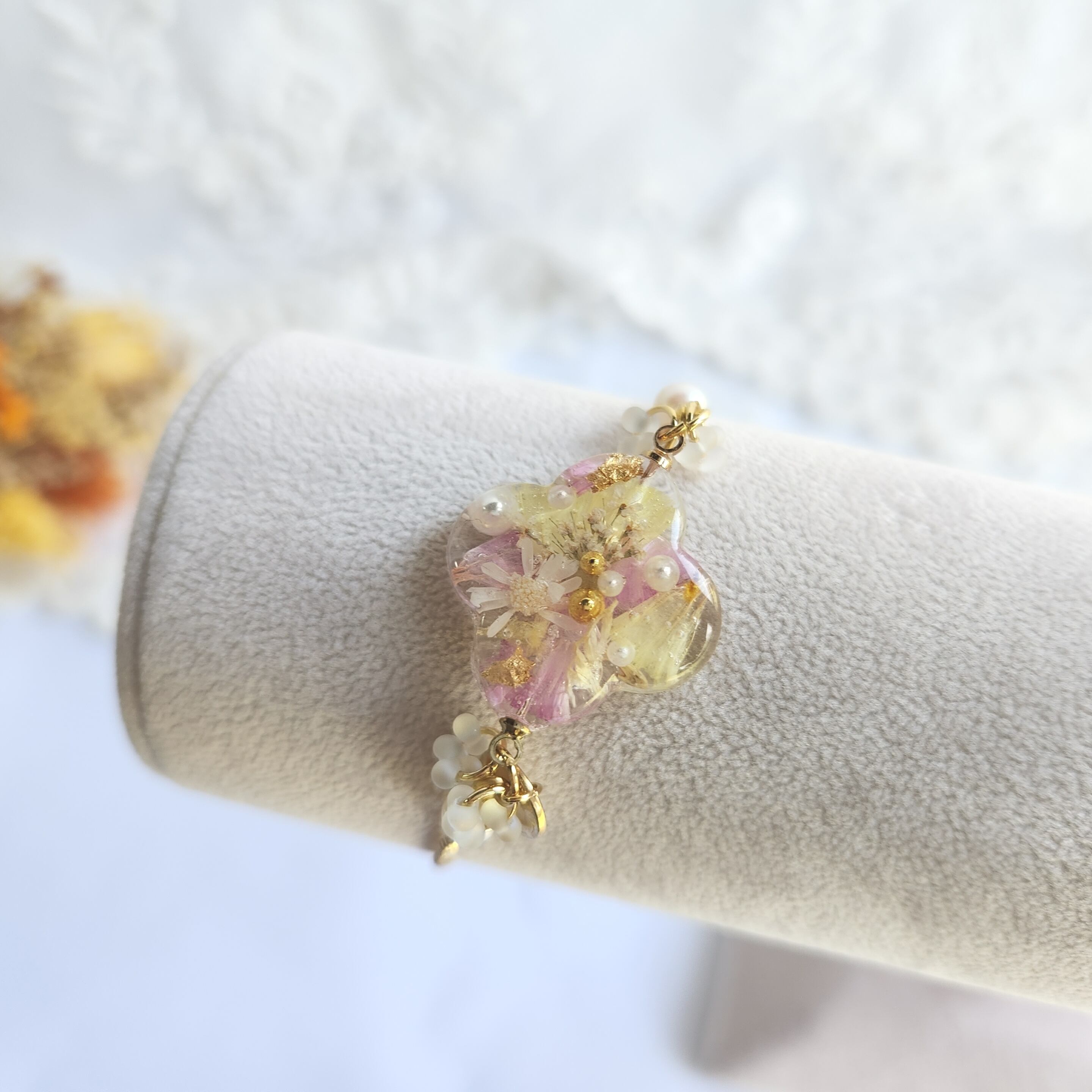おしゃれで上品な【イエロー&ピンク】大人綺麗めフラワーレジンブレスレットをぜひお試しください!
