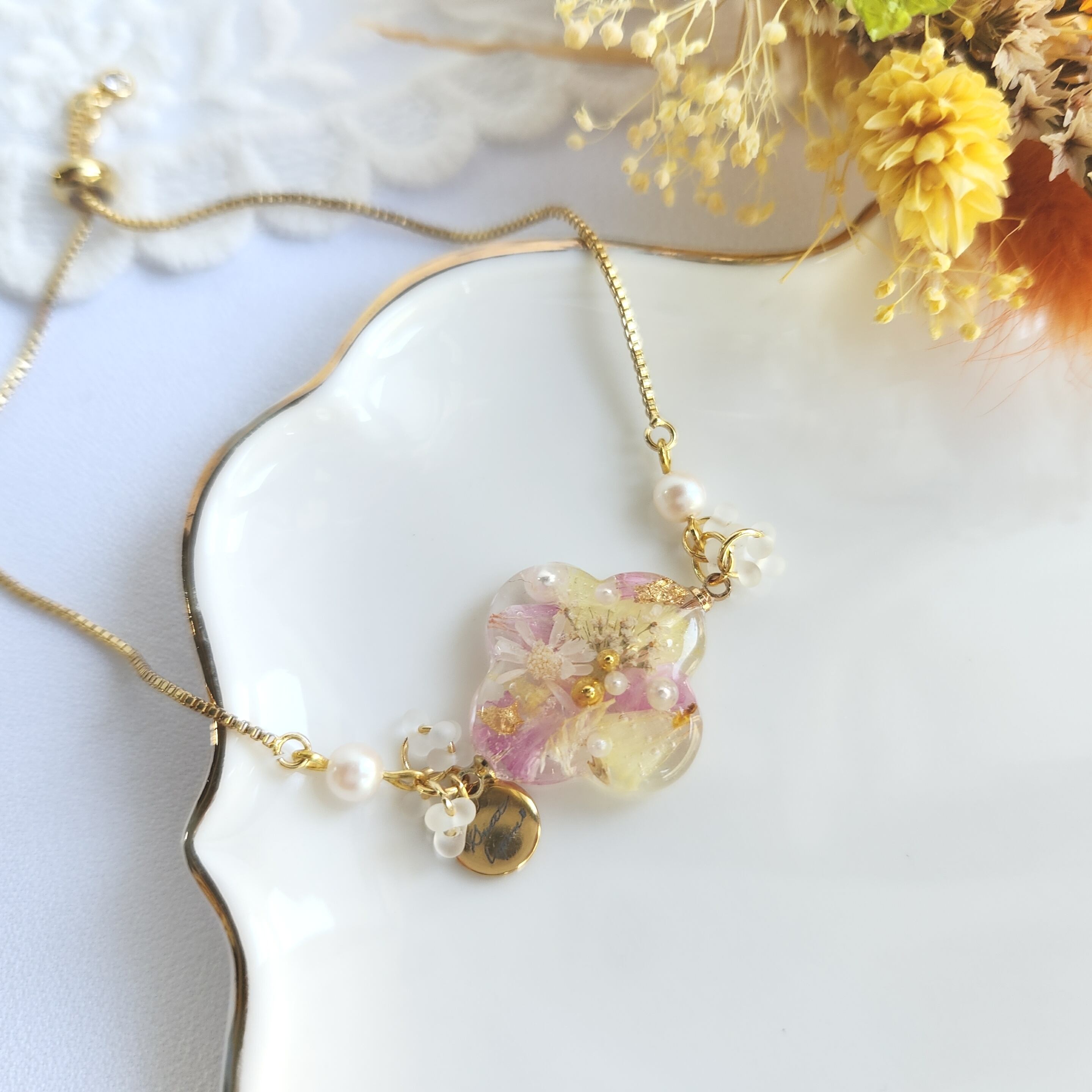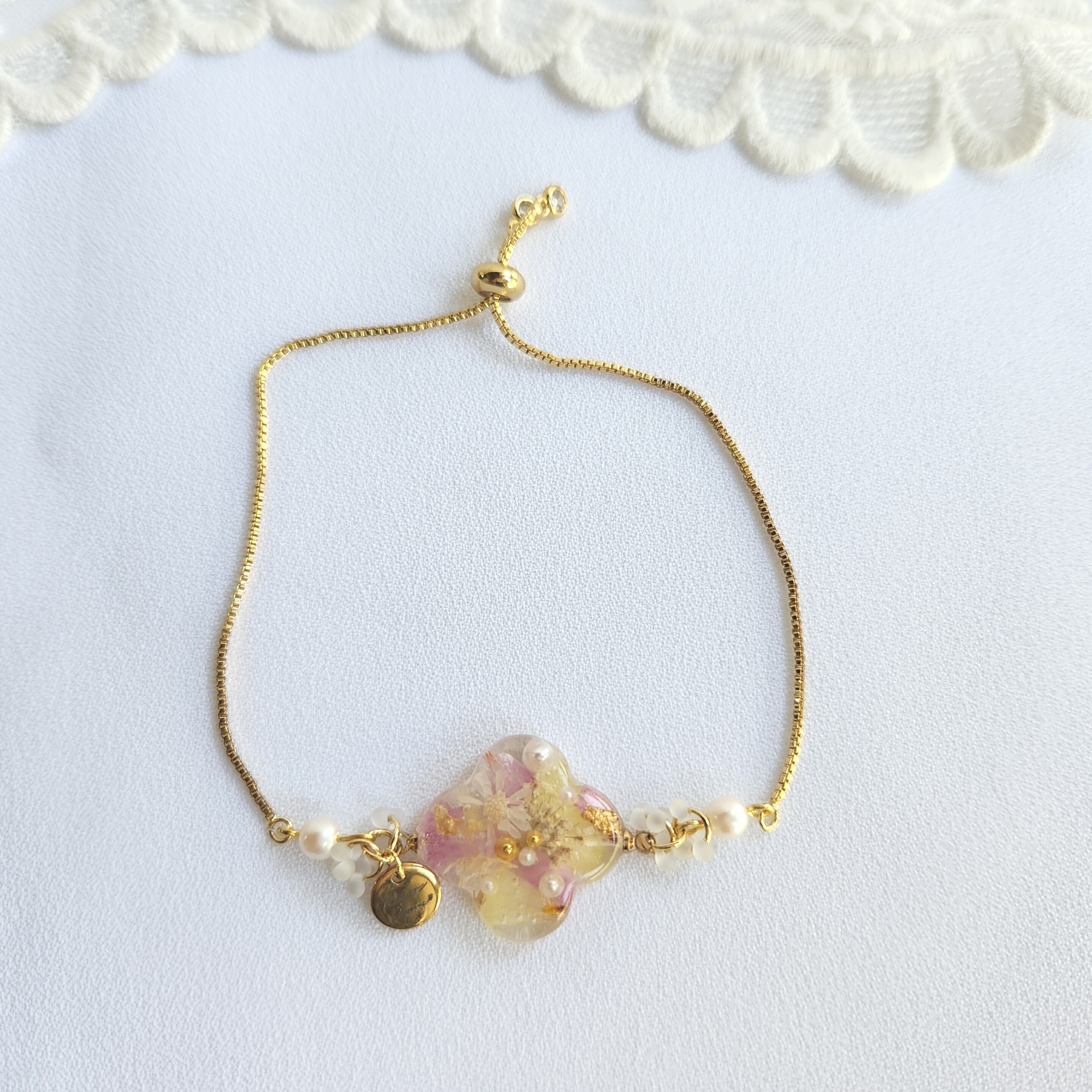 【イエロー&ピンク】大人綺麗め フラワー レジン スライド式ブレスレット♡ドライフラワー 上品 綺麗め 普段使い 着脱簡単 フリーサイズ